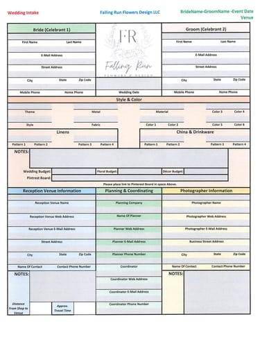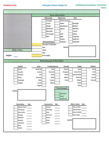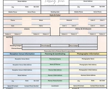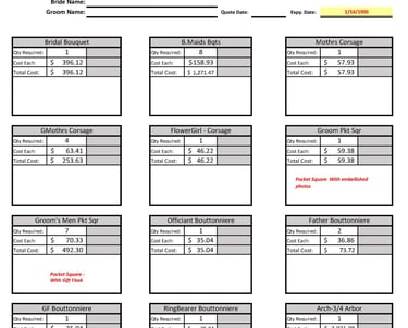 The Floral Consultation- This is a meeting with the Floral Designer to discuss what is needed or wanted for your Event. The better prepared for this step you are the easier it is for everyone involved. These can range in length from 1 hour to 3 hours on average. We need to transfer and translate the vision or picture in your mind into detailed information that we can use to make that vision a reality. This requires a lot of detailed information relating to Colors, Shapes, Patterns, Quantities, Dimensions & Measurements, etc...Depending on the client's need it may also involve in depth conversations regarding Cultural or Religious/Spiritual needs or specifics. All of these are important when designing for the end effect of an Event. Sometimes we have shared knowledge and experiences and sometimes we do not so we must rely on communication and detailed or probing questions to learn what is desired. This can cover a lot of area; from Flower Types, Dress Patterns, Linen Patterns, China Types, etc. The clearer your vision and your ability to communicate it the easier this step is.